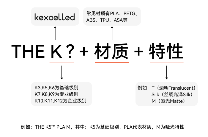例如,我们的热销产品THE K5™ PLA M,其中PLA代表材质,M是英文Matte的缩写,也就是哑光。这款线材便是以PLA为基材,特性是哑光质感。